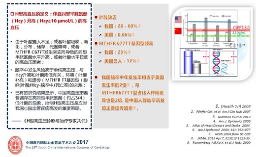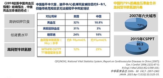 我國腦卒中高發(fā),臨床數(shù)據(jù)顯示:我國高血壓人群,腦卒中/心肌梗死發(fā)病比值約5~8:1。相較于美國,在排除傳統(tǒng)高血壓、高膽固醇血癥、糖尿病等病因基礎(chǔ)上,提出,伴有血同型半胱氨酸(Hcy)升高的高血壓患者,腦卒中的發(fā)病率明顯升高。中國約75%的高血壓患者合并血同型半胱氨酸升高。