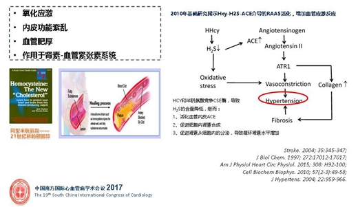Hcy和RAAS的病理生理基礎(chǔ)為: Hcy和半胱氨酸競爭CSE酶,導(dǎo)致H2S的含量降低,繼而:1、活化血管內(nèi)皮ACE;2、促進細胞內(nèi)腎素合成;3、促進腎素從細胞內(nèi)的分泌,導(dǎo)致循環(huán)腎素水平增加。