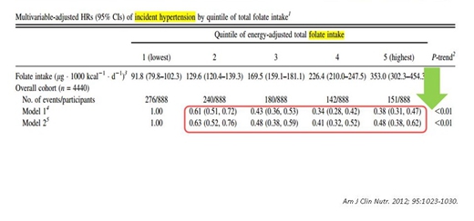 2012年,Am J Clin Nutr雜志發(fā)表文章,一項Coronary Artery Risk Development in Young Adults (CARDIA) study研究顯示:4400例受試者隨訪20年,高葉酸攝入,可使新發(fā)高血壓風(fēng)險顯著降低52%。