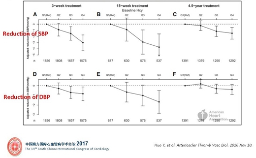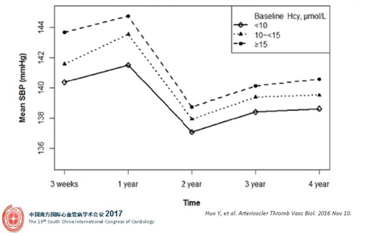 從這張圖可以看到,隨著Hcy水平的升高,收縮壓(SBP)經(jīng)3周、15周和4.5年的平均下降值(入組時血壓-治療后血壓)逐漸減少,也就是說,基線Hcy水平越高,血壓越難降。Hcy水平影響高血壓患者短期、中期和長期降壓療效。研究報告見于霍勇教授2016年Arterioscler Thromb Vasc Biol雜志。