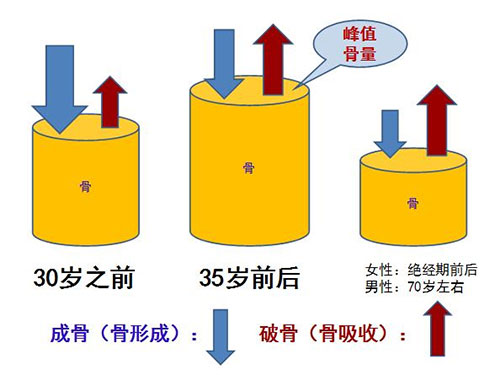 人一生的骨量是一個動態平衡的狀態,在30歲之前時,體內的骨量呈上升趨勢,35歲前后達到峰值,之后體內的骨量開始不斷下滑。