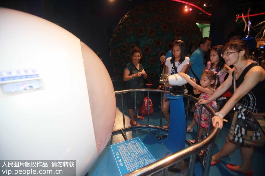 2011年8月4日,在中國科技館里,一個小朋友正在體驗模擬眼底激光治療儀。