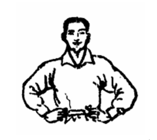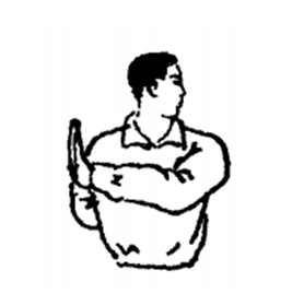 ④ 低頭含胸,兩手交叉放于背后,肘半屈,手心向上,隨后挺胸用力伸肘,同時反掌向下,后頸部向上伸,感覺后頸部肌肉用力收緊即可,重復10次。