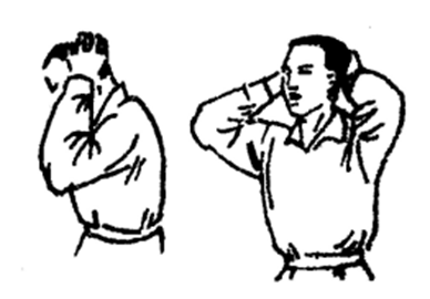 ③ 兩手掌托住下頜,用力低頭,使下頜下壓,同時手掌頂住下頜不讓它向下,然后放松,重復10次;