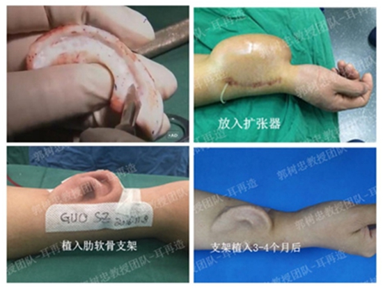 除了換臉術,他也是國內著名的耳再造專家,他利用患者胸部肋骨的軟骨“雕刻”出耳朵的輪廓,并預制在患者的前臂,經過幾個月的“生長”,成為形態逼真的耳朵,再取下來移植到患者的頭部。目前,他的耳再造技術已經發展到4.0。