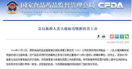 2016年7月,國家食品藥品監督管理總局批準葛蘭素史克(GSK)公司的預防用生物制品——人乳頭瘤病毒吸附疫苗的進口注冊申請。國家食品藥品監督管理總局官網同時指出“該產品系采用桿狀病毒表達系統分別表達重組HPV16和18型的L1病毒樣顆粒,經純化,添加MPL和氫氧化鋁佐劑等制備的雙價疫苗。該疫苗是首次申請在我國上市的新疫苗,研究數據表明在國內目標人群中應用的安全性和有效性與國外具有一致性。該疫苗的批準,為我國宮頸癌的預防提供了新的有效手段!