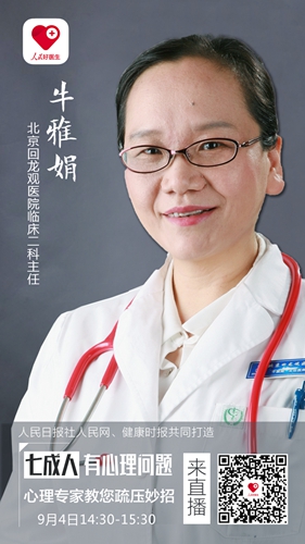 那么,應該如何紓解壓力呢?9月4日(周一)下午2:30-3:30,由人民日報社人民網、健康時報聯手打造的“人民好醫生”客戶端邀請到北京回龍觀醫院臨床二科主任牛雅娟進行視頻、圖文直播,并在線解答廣大網友的問題!