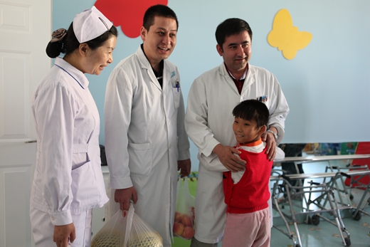 2012年5月17日腦癱中心木塔力甫、艾克拜爾等醫護人員赴烏魯木齊兒童福利院回訪腦癱患兒圖為在我院接受過手術、康復治療的孤殘兒童新雨婷緊緊抱住救過她醫護人員。攝影:劉陽