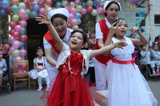 2013年5月30日新疆醫科大學第二附屬醫院腦癱中心醫護人員為腦癱患兒過六一,圖為正在康復中的腦癱患兒在護士的幫助下表演節目。攝影:周小華
