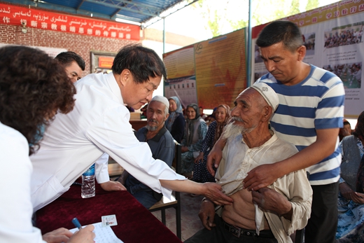2016年6月3日在和田地區墨玉縣加依巴格村村民們為了感謝醫療隊,義診結束后跳起了歡快的麥西來普