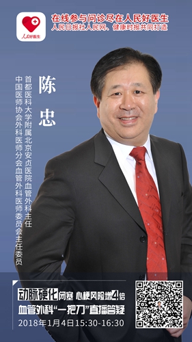 2018年1月4日(周四)下午15:30-16:30,首都醫科大學附屬北京安貞醫院血管外科主任、中國醫師協會外科醫師分會血管外科醫師委員會主任委員陳忠教授將做客人民日報社人民網、健康時報聯手打造的“人民好醫生”客戶端,直播解答各種類型動脈瘤、動脈硬化、動脈狹窄和閉塞等血管疾病相關問題。