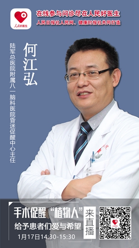 植物人群體的生存狀態是什么樣的?植物人的合法權益何以維護?怎樣才能讓植物人更有尊嚴地活著?1月17日(周三),下午14:30,由人民日報社人民網、健康時報聯手打造的“人民好醫生”客戶端將邀請陸軍總醫院附屬八一腦科醫院昏迷促醒中心主任何江弘進行視頻、圖文直播,并在線解答網友關于“植物人”促醒治療的相關提問,千萬不要錯過!