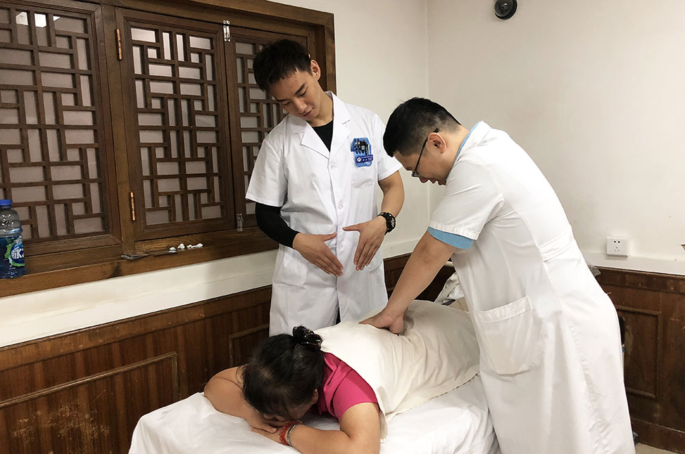 推拿理療科帶教老師沈潛副主任細心指導規培醫生原山的治療手法