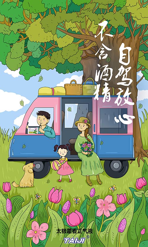 駕車出行,記得服用不含酒精的太極藿香正氣液,不擔心酒駕,為您的旅途健康保駕護航。