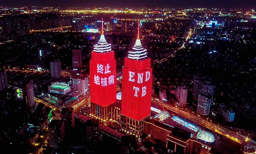 在中國的北京、天津、上海、浙江、廣東、重慶6省(市)省會城市的地標建筑,為終止結核病的承諾映亮通紅,壯觀無比。