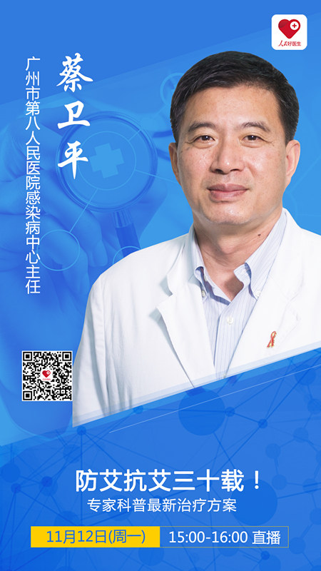 11月12日(周一)15:00-16:00,廣州市第八人民醫(yī)院感染病中心主任蔡衛(wèi)平將在“人民好醫(yī)生”App進(jìn)行科普直播,并在線解答大家關(guān)于艾滋病的各種困惑,別錯(cuò)過(guò)哦!