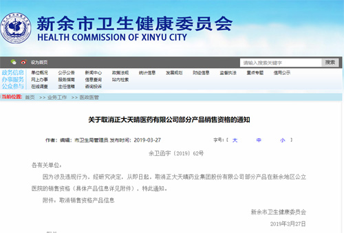 人民網北京3月29日電(楊迪 董童)3月27日,江西省新余市衛生健康委員會發布《關于取消正大天晴醫藥有限公司部分產品銷售資格的通知》(以下簡稱《通知》),經研究決定,從即日起,取消正大天晴藥業集團股份有限公司部分產品在新余地區公立醫院的銷售資格。