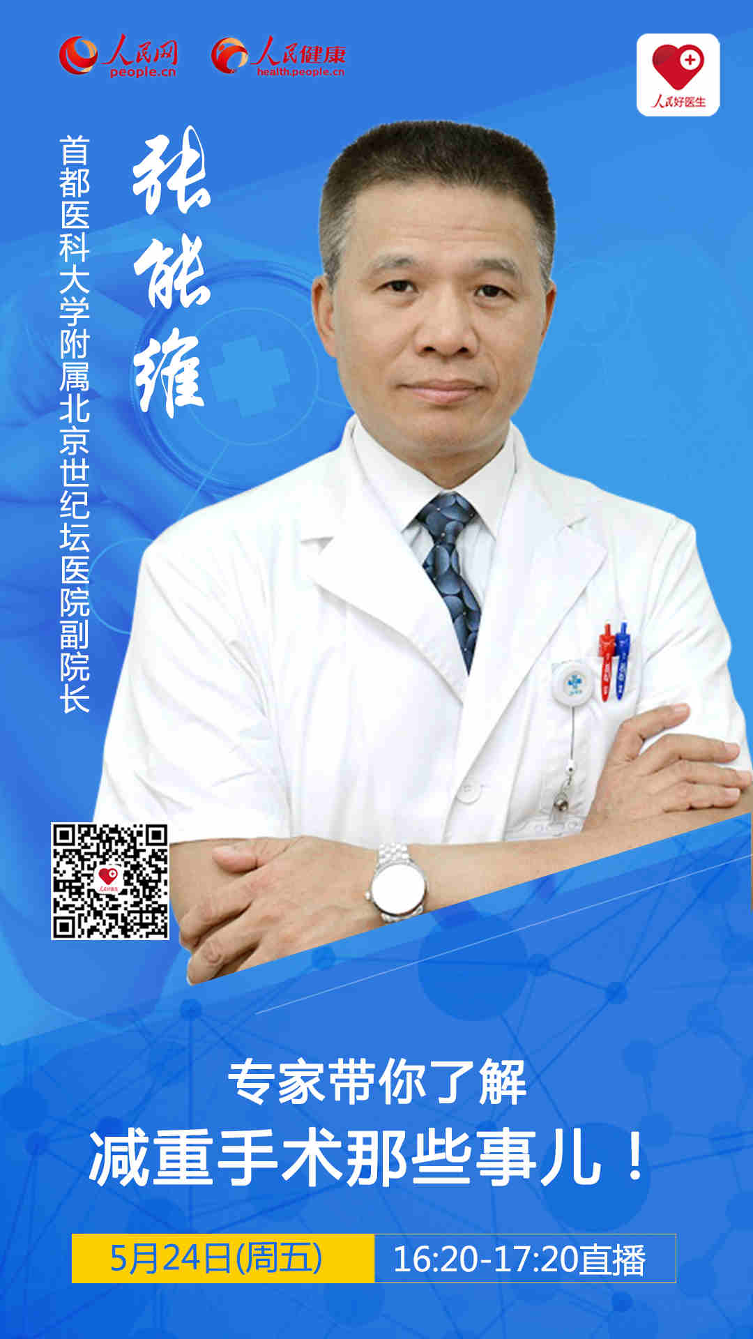 減重手術(shù)的原理是什么?哪些人可以選擇,術(shù)后又該如何護(hù)理?2019年5月24號(周五)16:20-17:20,首都醫(yī)科大學(xué)附屬北京世紀(jì)壇醫(yī)院副院長 張能維將在“人民好醫(yī)生”App進(jìn)行科普直播,并在線解答大家的各種困惑,歡迎掃碼觀看!