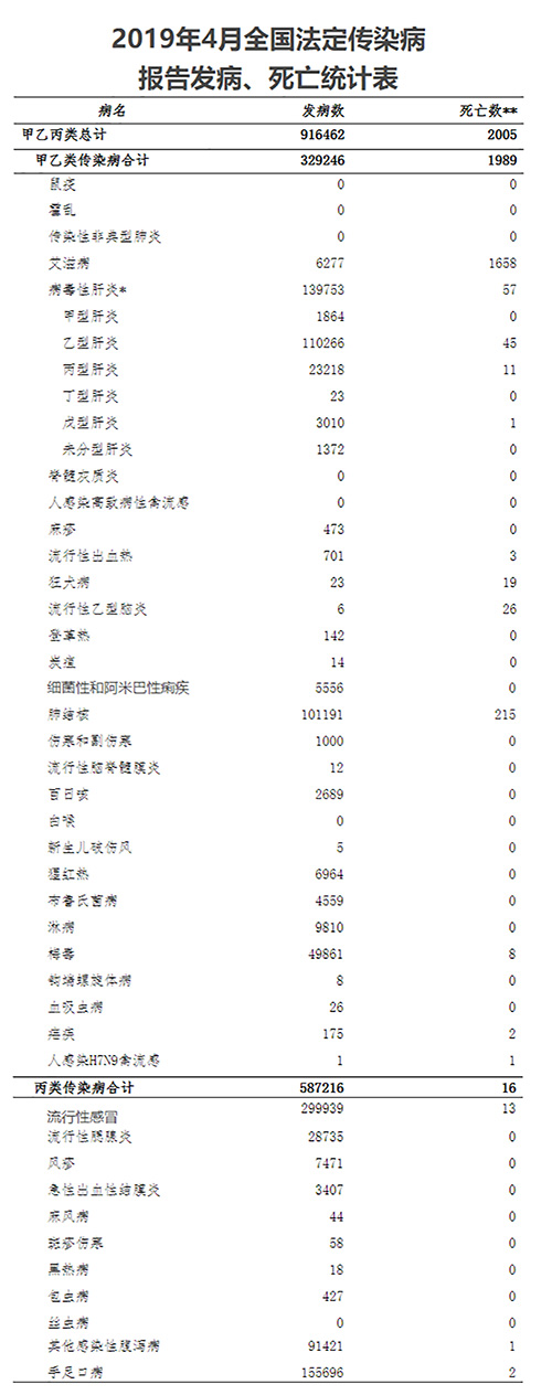 附:2019年4月全國法定傳染病報告發病、死亡統計表