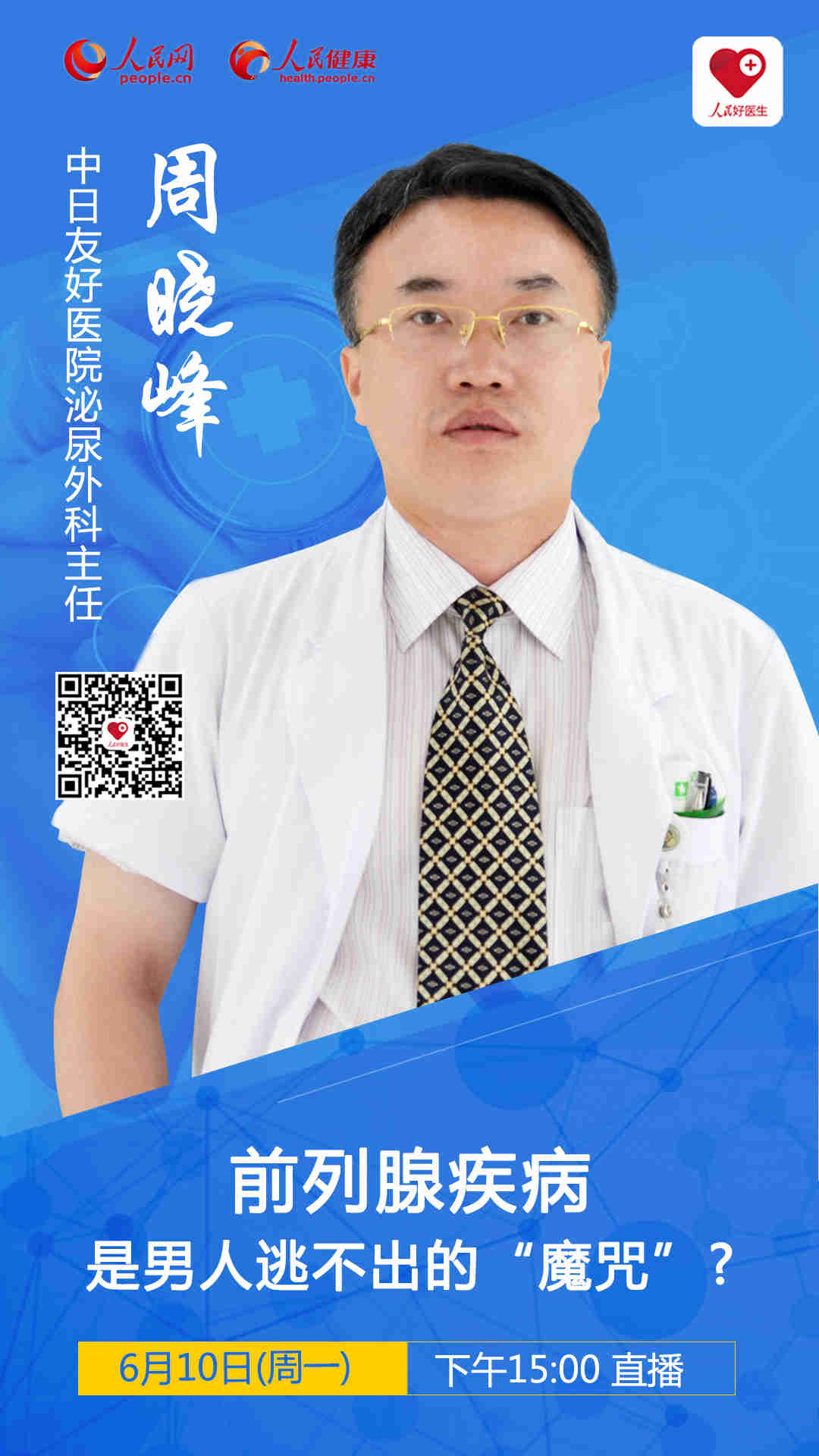 2019年6月10日(周一)15:00,“人民好醫(yī)生”客戶端將邀請(qǐng)中日友好醫(yī)院泌尿外科主任周曉峰進(jìn)行視頻和圖文直播,提高人們對(duì)前列腺疾病的認(rèn)識(shí),做到早期診斷和及時(shí)治療,并在線解答廣大網(wǎng)友相關(guān)問題,千萬不要錯(cuò)過!