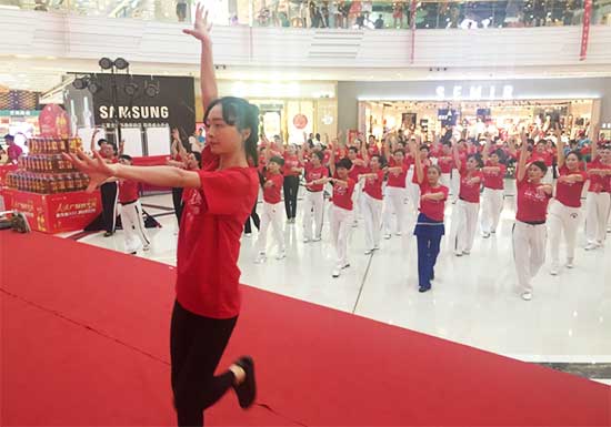活動現場,一支手持健身球的舞隊,在歡快的節奏帶動下,手中的健身球上下飛舞,有節奏的擊打著參賽者身上的各個穴位。