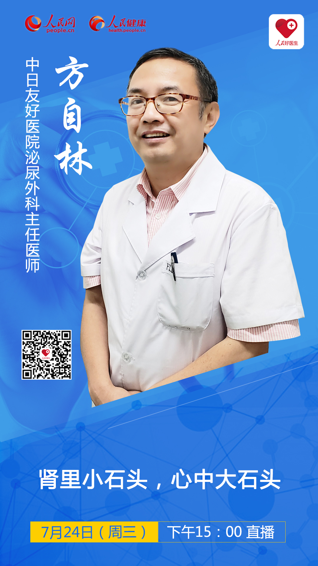 2019年7月24日(周三)下午15:00,“人民好醫生”客戶端將邀請中日友好醫院泌尿外科主任醫師方自林進行視頻和圖文直播,詳細講解腎結石形成的原因、癥狀及治療。并在線解答廣大網友相關問題,千萬不要錯過!