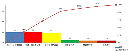 為解決這些問題,東阿縣人民醫(yī)院成立了持續(xù)質(zhì)量改進(jìn)小組,分析出了形成問題的具體原因。然后,在小要因中選出主要因素6項(xiàng),進(jìn)行投票,計(jì)算各項(xiàng)累積百分比,繪制成柏拉圖。并利用“80/20定律”,找出需要改進(jìn)的80%的因素為:無(wú)統(tǒng)一的檢查項(xiàng)目、無(wú)統(tǒng)一的檢查標(biāo)準(zhǔn)及缺乏相關(guān)的培訓(xùn)三項(xiàng)。