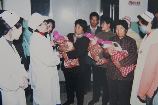 1990年代,一家人抱著早產的三胞胎在兒科治療后出院,家長臉上的喜悅溢于言表