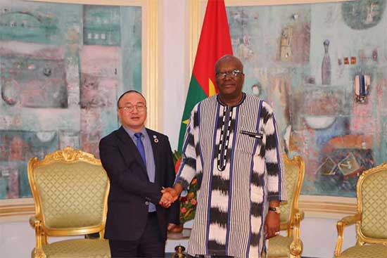 當(dāng)?shù)貢r間2019年7月29日,布基納法索總統(tǒng)Roch Marc Christian Kaboré 羅克·馬克·克里斯蒂安·卡博雷(右一)會見運鴻集團(tuán)董事局主席董事長李玉保先生(左一)