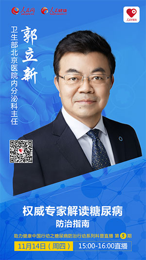 2019年11月14日 周四15:00-16:00,衛生部北京醫院內分泌科主任、中華醫學會糖尿病學分會候任主委郭立新教授將在“人民好醫生”客戶端進行視頻、圖文直播,并在線解答關于糖尿病防治方面的問題,千萬不要錯過!