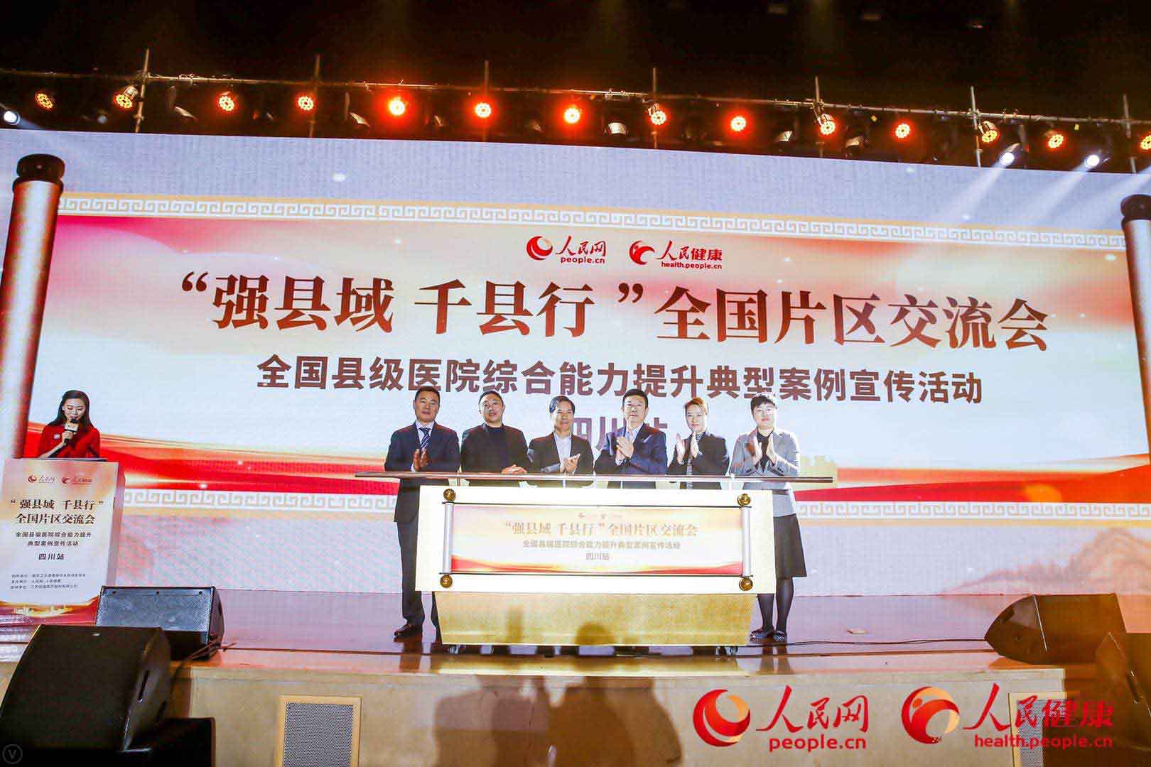 隨后,四川省衛生健康委二級巡視員彭杰,人民網人民健康副總經理董雪松,四川省衛生健康委醫政醫管處副處長向祚敏,中國人民大學醫改研究中心副研究員張靜,江蘇恒瑞醫藥股份有限公司副總經理劉濤,人民網人民健康“強縣域 千縣行”專項負責人李镕君共同宣布“強縣域 千縣行”全國片區交流會、全國縣級醫院綜合能力提升典型案例宣傳活動四川站啟動。