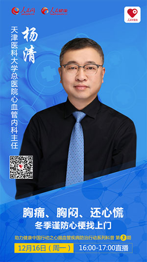 2019年12月16日(周一)下午16:00-17:00,“人民好醫(yī)生”客戶端將邀請(qǐng)天津醫(yī)科大學(xué)總醫(yī)院心血管內(nèi)科主任楊清教授進(jìn)行視頻和文字直播,給大家講解冬季心梗的預(yù)防和急救方法,還可以在線向楊教授提問(wèn),幫大家解疑答惑,記得提前下載“人民好醫(yī)生”APP,觀看健康直播。