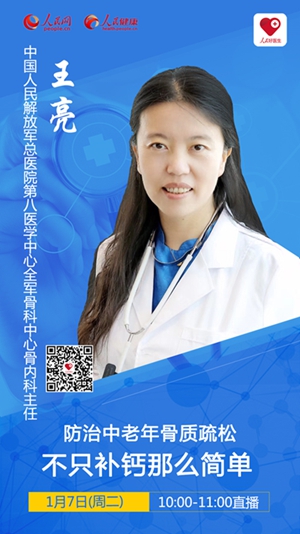 2020年1月7日(周二)上午10:00,“人民好醫生”客戶端將邀請中國人民解放軍總醫院第八醫學中心全軍骨科中心骨內科主任王亮進行視頻和圖文訪談,為您解答骨質疏松科普知識,以及老年骨質疏松診療和防治,敬請關注。
