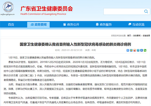 據(jù)廣東省衛(wèi)生健康委員會20日凌晨于官網(wǎng)發(fā)布的《國家衛(wèi)生健康委確認(rèn)我省首例輸入性新型冠狀病毒感染的肺炎確診病例》顯示,1月19日,國家衛(wèi)生健康委確認(rèn)廣東省首例輸入性新型冠狀病毒感染的肺炎確診病例。