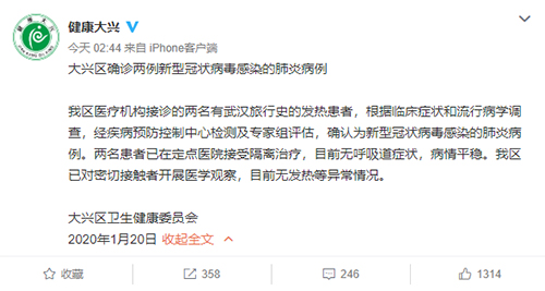 另據(jù)北京市大興區(qū)衛(wèi)生健康委員會20日凌晨于官方微博發(fā)布消息,大興區(qū)確診兩例新型冠狀病毒感染的肺炎病例。