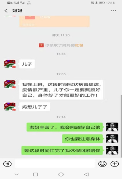 這一次,面對疫情,母子二人共同堅守在各自的崗位上,當看到媽媽在微信中說想兒子時,孫泰紅著眼睛敲去了幾個讓人流淚的字眼:“等這段時間忙完了,我休假回家陪您!”