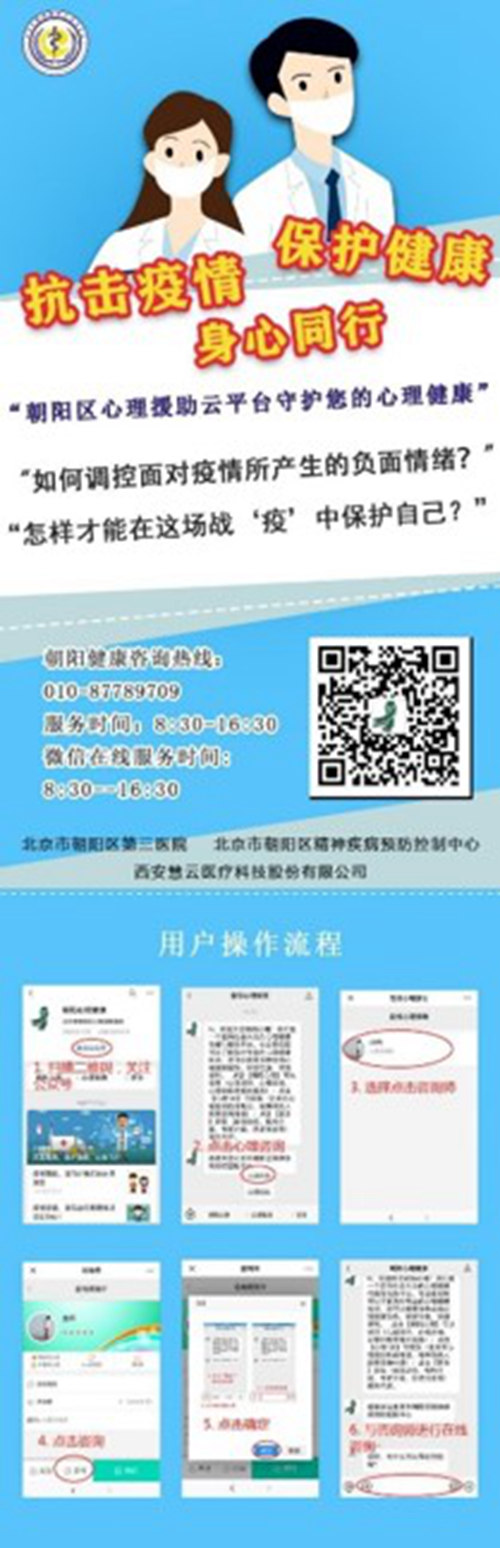 據了解,北京市朝陽區自2月14日起,依托“朝陽心理健康”微信公眾號啟動線上心理援助服務,為有需求的群眾提供心理支持。公眾可通過關注微信公眾號,在線學習心理健康知識、進行心理測評和心理咨詢。