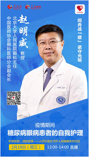 2020年2月19日 (周三)下午13:00,“人民好醫(yī)生”客戶端將邀請北京大學(xué)人民醫(yī)院眼科與眼視光中心主任趙明威教授進(jìn)行視頻直播,結(jié)合糖尿病患者眼病的特點(diǎn),科普眼科疾病評估、治療及術(shù)后日常護(hù)理。
