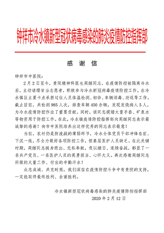 人民網北京2月23日電 “向周繼同志表示最誠摯的感謝,感謝他主動請纓參加鐘祥市冷水鎮疫情防控工作……”這是湖北省鐘祥市中醫院精神科主治醫師周繼家鄉的疫情防控指揮部寫給他的感謝信。感謝他堅守在農村疫情防控的第一線。