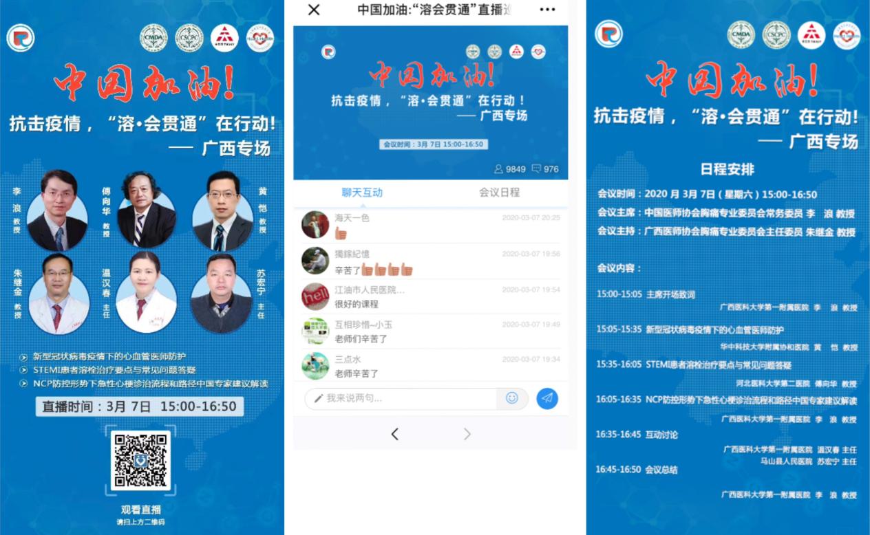 廣西醫(yī)科大學(xué)第一附屬醫(yī)院李浪教授、廣西醫(yī)科大學(xué)第一附屬醫(yī)院朱繼金教授、河北醫(yī)科大學(xué)第二醫(yī)院傅向華教授、華中科技大學(xué)同濟(jì)醫(yī)學(xué)院附屬醫(yī)院黃愷教授等心血管領(lǐng)域?qū)<裔槍?duì)新型冠狀病毒疫情下的STEMI 患者救治原則、溶栓治療的常見問題做講解。據(jù)統(tǒng)計(jì),本次會(huì)議直播有9800多人次觀看,互動(dòng)留言970多條。