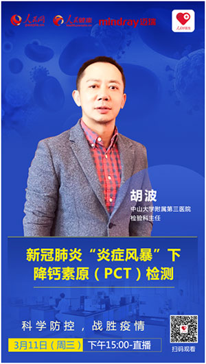 2020年3月11日(周三)15:00,中山大學附屬第三醫院檢驗科主任胡波將進行直播訪談,在線講解新冠肺炎“炎癥風暴”下降鈣素原(PCT)檢測。訪談將在人民健康APP、人民好醫生APP同步推出。