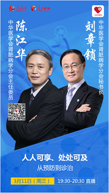 在我國,腎臟病患者已接近1.32 億,為幫助大眾深刻了解腎臟病,預防腎臟病的發生以及防止其加重,3月11日(周三),“人民好醫生”客戶端將邀請中華醫學會腎臟病學分會主任委員、浙江大學醫學院附屬第一醫院腎臟病中心主任陳江華教授,中華醫學會腎臟病學分會秘書長、鄭州大學第一附屬醫院院長劉章鎖教授進行視頻直播,為大家帶來腎臟保護的相關知識。