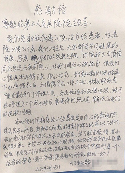 急患者之所急,呼吸內科九病區的醫護們做到了。在開科的第二天,他們就收到了患者親手寫的感謝信。信中寫到,“您們急患者之所急,想患者之所想的精神深深的感動了我,我感謝您們所有不動聲色的善良。”