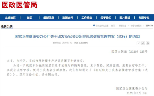 人民網北京3月16日電(董童)隨著治愈出院患者的不斷增多,為做好出院患者的隔離管理、隨訪復診、健康監測、康復管理等一攬子工作,促進新冠肺炎全流程管理、促進患者全面康復,國家衛生健康委于13日在官網發布了《新冠肺炎出院患者健康管理方案(試行)》(以下簡稱“方案”)。