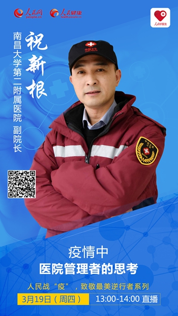2020年3月19日(周四)13:00-14:00,“人民好醫生”客戶端邀請到南昌大學第二附屬醫院副院長、江西首批援鄂醫療隊隊長 祝新根進行視頻直播,與您分享疫情中醫院管理者的思考。