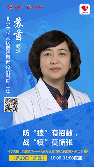 2020年03月20日(周五)10:00-11:00,“人民好醫生”客戶端將邀請北京大學人民醫院風濕免疫科副主任蘇茵教授進行視頻直播,結合系統性紅斑狼瘡診療的特點,科普疾病的治療及日常管理,千萬不要錯過。