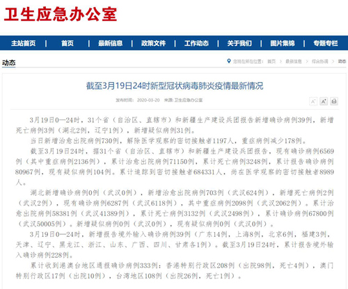 人民網北京3月20日電(董童)國家衛生健康委于20日在官網發布的《截至3月19日24時新型冠狀病毒肺炎疫情最新情況》(以下簡稱“情況”)稱,3月19日0—24時,31個省(自治區、直轄市)和新疆生產建設兵團報告新增確診病例39例,新增死亡病例3例(湖北2例,遼寧1例),新增疑似病例31例。當日新增治愈出院病例730例,解除醫學觀察的密切接觸者1197人,重癥病例減少178例。