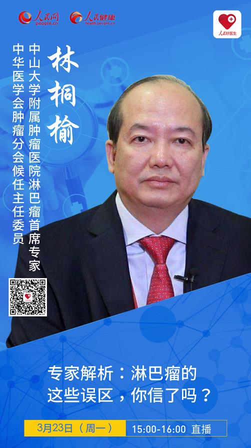 2020年3月23日(周一)15:00-16:00,“人民好醫生”客戶端邀請到中山大學附屬腫瘤醫院淋巴瘤首席專家,中華醫學會腫瘤分會候任主任委員林桐榆教授,來與我們共同交流一下淋巴瘤的相關問題。
