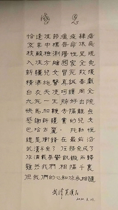 3月17日,巴哈古麗和隊員們離開武漢,回到了離開一個多月的新疆。在隔離期間,她仍舊在醫(yī)患微信群里為患者們唱歌打氣,同他們聊武漢,聊新疆。