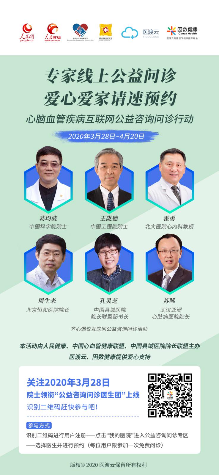 據了解,此次心腦血管疾病互聯網健康公益咨詢問診行動,在中國科學院、中國心血管健康聯盟主席、上海復旦大學附屬中山醫院葛均波院士號召下,中國縣域醫院院長聯盟執行主席、北大醫院心內科、心臟中心霍勇教授,江蘇省人民醫院孔祥清教授,廣東省南方醫院吳平生教授,中國心血管健康聯盟秘書長方唯一教授,北京協和醫院王崇慧教授,北京天壇醫院徐東教授,武漢協和醫院黃愷教授,蘭州大學第一醫院張鉦教授等專家已經應邀參加并初步確認了咨詢問診時間,同時更多專家將陸續加入到這次公益咨詢問診行動中。